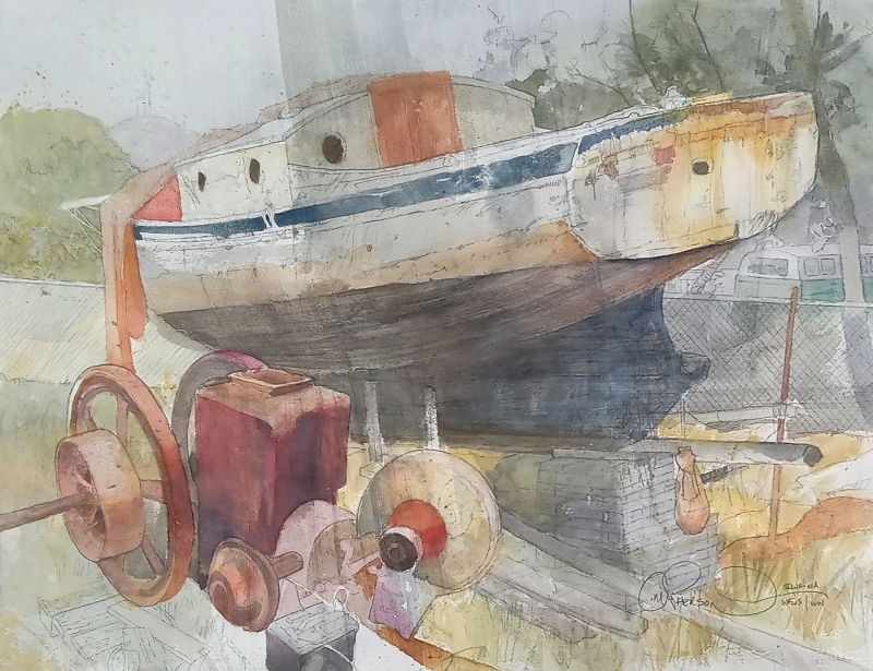 I noticed this powerful piece from across the room. I usually look for different compositional components like diagonals, but there was something sort of popping out of this image of this turtle in this environment, that it is a real part of. It’s an extremely textural piece. It almost looks like it’s fabric because of the shape being like a swatch, and coming together to make a greater thing, like a quilt. And that’s echoed of course by the shell of the turtle, but some of the other things in the painting seemed collaged as well. It is a watercolor, but here I am thinking about quilts, and I think when a painting can take you outside of what it is, that’s a really unique thing. It seems like it tells a story and I like that.