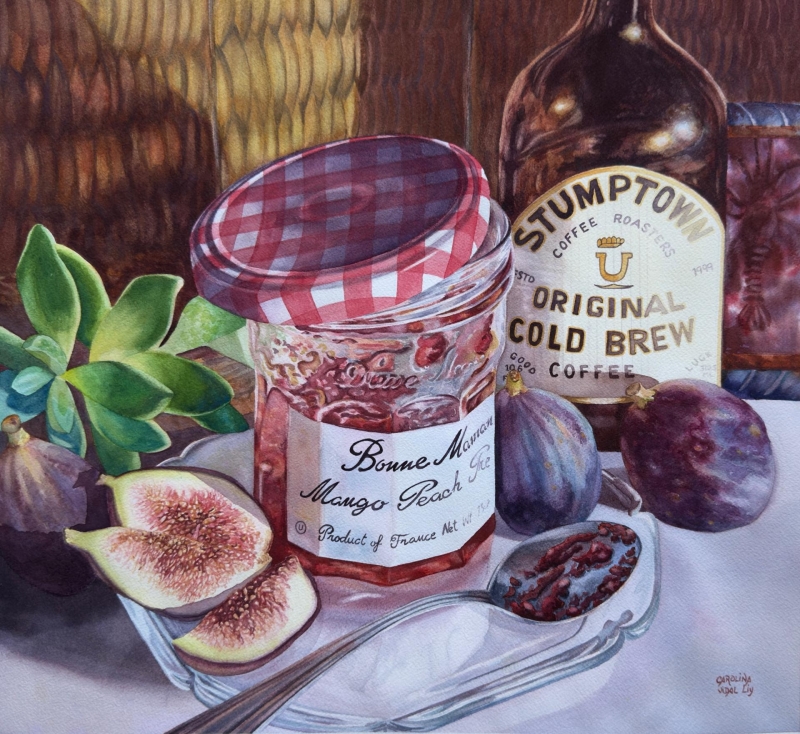 I appreciate the details in this painting, and the technical ability that the artist has with the watercolor. I admire all the reflections and the texture, and the details of the lettering. All these are beautifully done. I also appreciate the unity of color – the purples and the red violets. I think the diagonals draw your eye into this skillful composition.