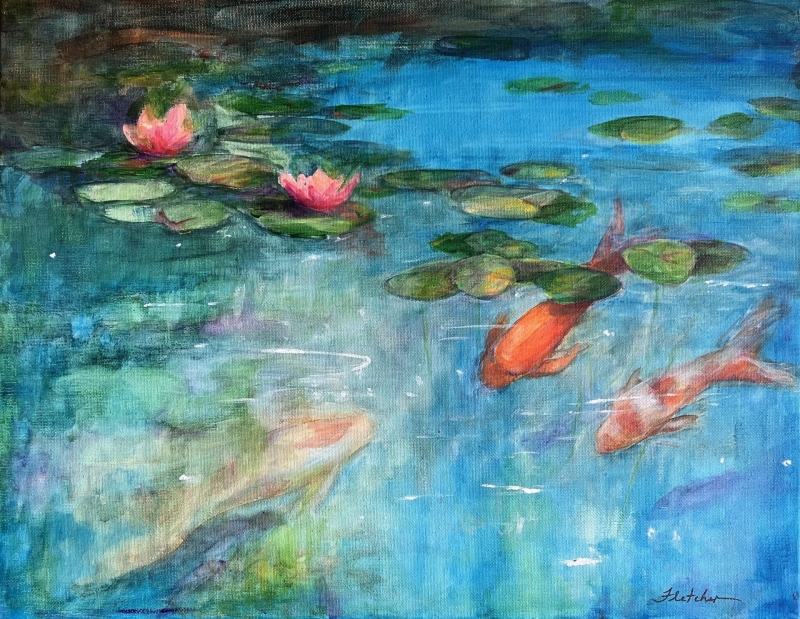 The cool colors of the water are in great contrast with the warm colors of the koi and the flowers. The composition, with the movement of the lily pads and koi draw your eye into the painting.