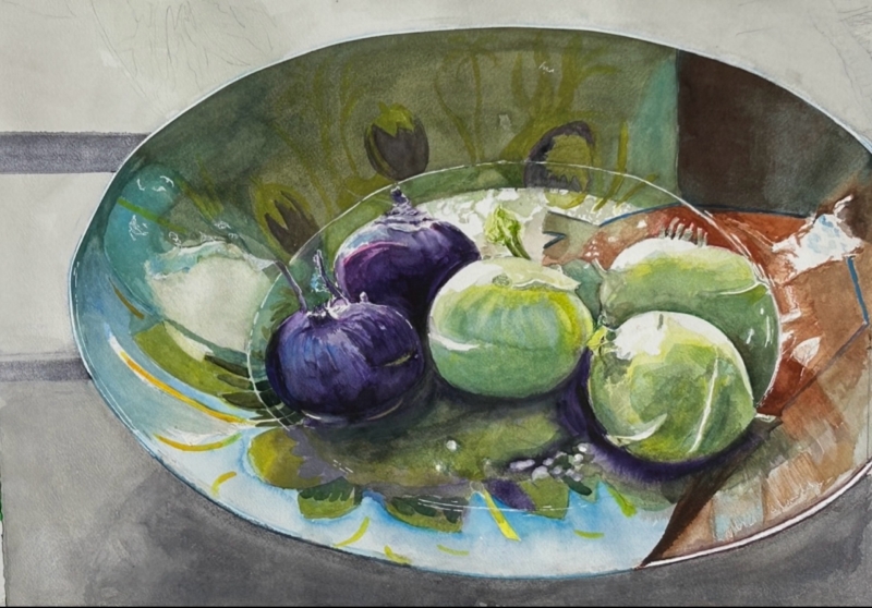 This painting is stunning. The colors all work together harmoniously, The composition is wonderful, with the bowl cut off on the edge and the patterns and shapes inside are circling the kohlrabi. It’s woven together beautifully, with the soft, transparent watercolor.