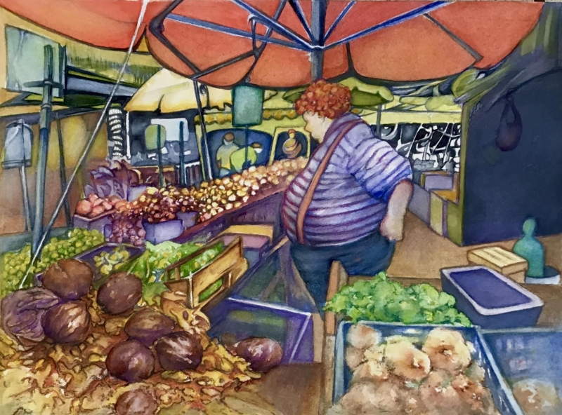 This painting is just fun. The diagonals draw you into the figure, who looks like they are contemplating every single vegetable in front of them. That orange umbrella overhead unifies the whole composition. I just enjoy it, and it makes me smile.