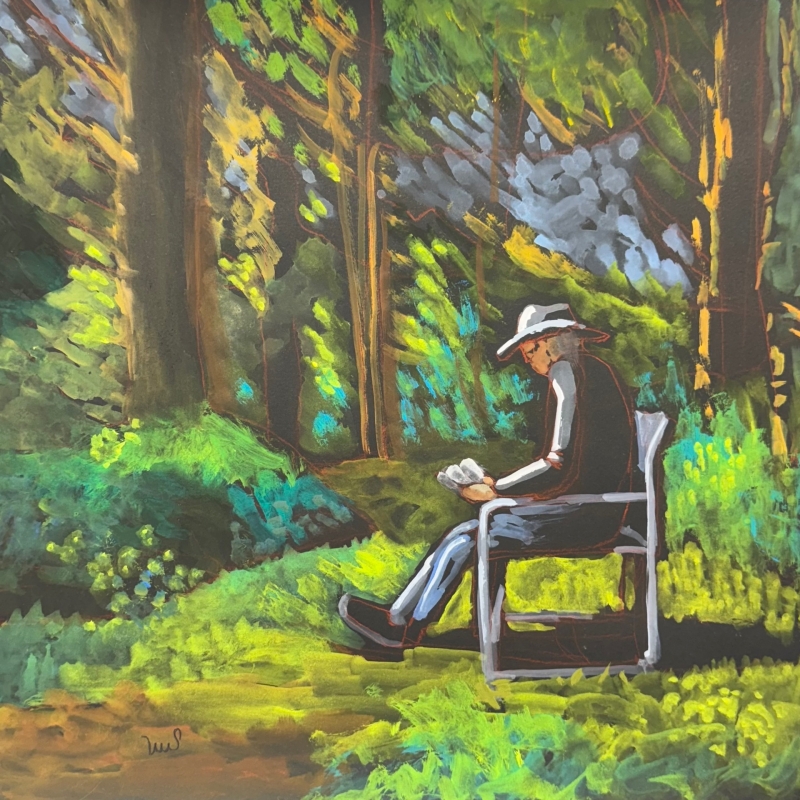 I’m drawn into the painting by the cool values of green, and the dabs of colors created with the paint strokes. The diagonals of these strokes moves the viewer’s eye into the light which is cast on the figure. You can feel yourself sitting in the warmth of the sun with him as he’s reading.