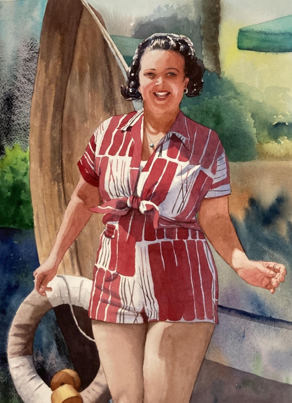 Well, Sally just looks like she’s having fun, and that she’d be a great friend to spend time with. I love the values in her romper, and the juxtaposition between the complementary colors of that red and the greens in the background. The artist really captured the warmth of the light on the figure. Wonderful!